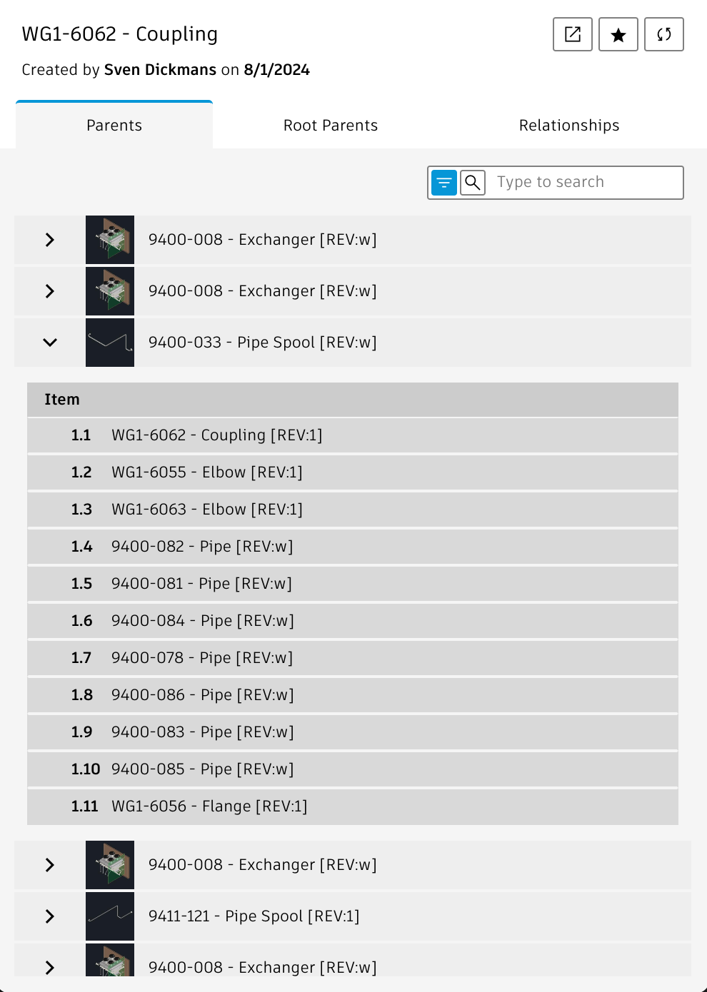 By passing a part number or a dmsId with wsId, users can access Where Used information of the related item in PLM. The tabs enable access to the immediate parents and their BOM as well as the root parents and relationships.