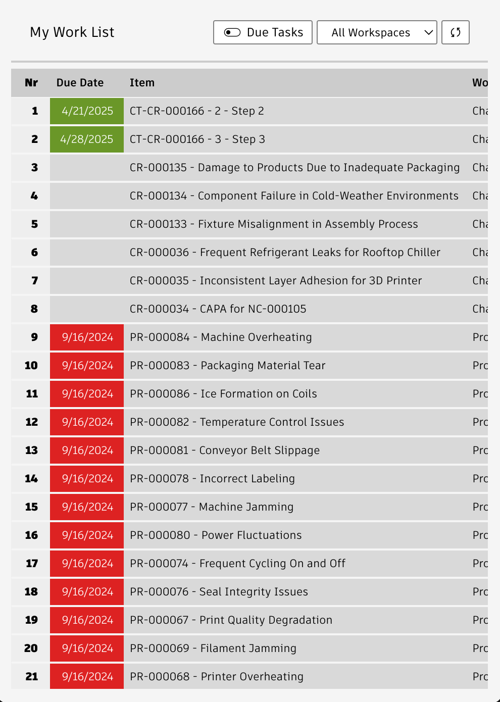 tasks.workspacesInTasks [ 'Change Tasks', 'Change Requests', 'Change Orders', 'Problem Reports' ]List of workspaces to be included in the tasks list. Workspaces not contained in this list will not be displayed.