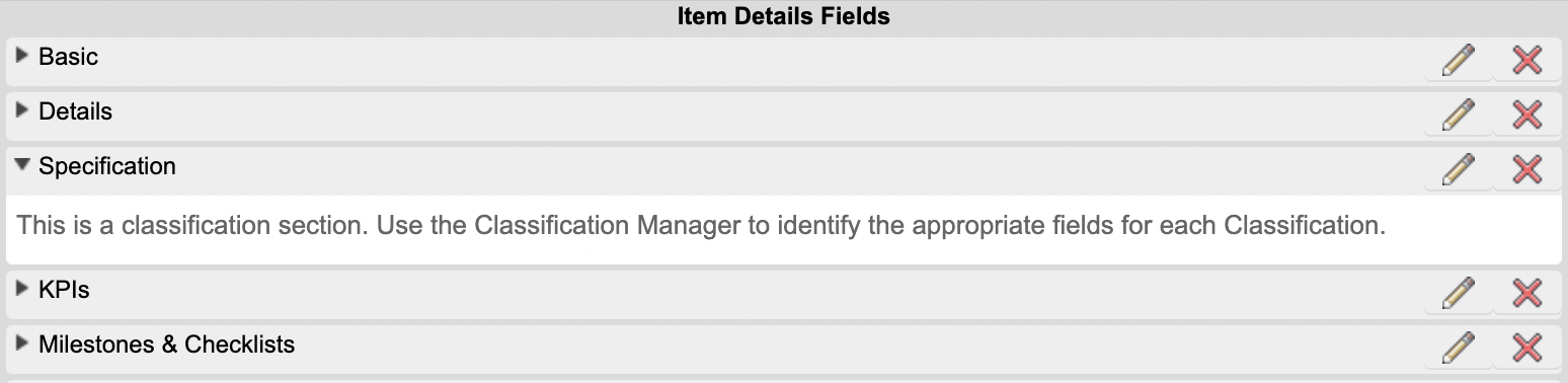 projects.projectDetailsSectionsEx [ 'Project Schedule', 'Closure' ]Defines sections to be excluded in the Item Details page. Leave this array blank to show all sections.
